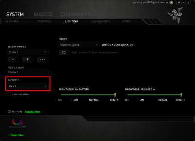 Change the lighting effects and colors of the razer keyboard to your desired effect under the lighting tab.